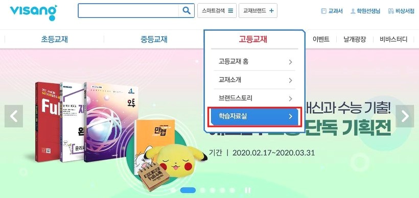 비상교재 공홈으로 접속을 해 보시게 되었다고한다면 상단에 보이시는 것처럼 이렇게 교재를 선택할수가있는 화면에 나오게되어 지는데 고등 교제를 선택해보시고 하단쪽에 있는 학습 자료실를 클릭해주세요.